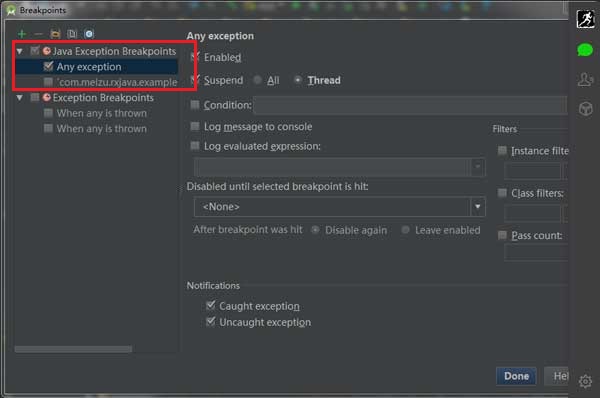 在Java Exception BreakPoint 那一栏钩上Any Exception,Done。如图: