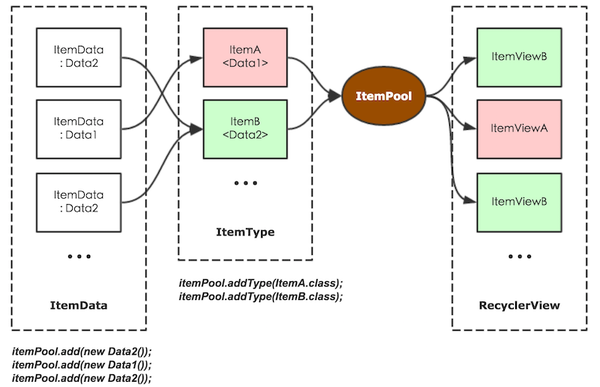 简而言之就是将指定类型的数据用指定类型的 Item 来展示。这十分容易理解,你只要记住哪个 Item 对应哪个数据类型,并往 ItemPool 中塞数据就行了。