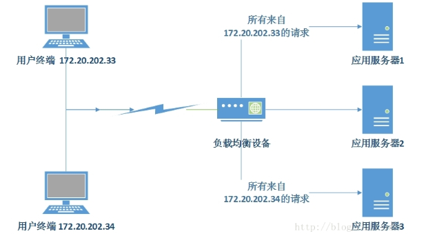 Session绑定可以利用负载均衡的源地址Hash算法实现,负载均衡服务器总是将来自同一个IP地址的访问分发到同一台服务器上。这样整个会话期间,用户所有的请求都来自一台服务器,保证了Session总是从这台服务器获取。其工作形式如下图所示: