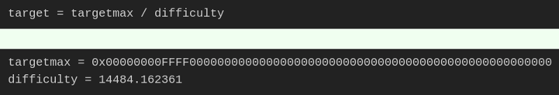 区块链协议规定,使用一个常量除以难度系数,可以得到目标值(target)。显然,难度系数越大,目标值就越小。