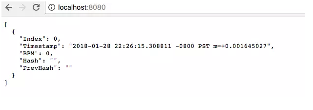 接着我们打开浏览器,访问 localhost:8080 这个地址,我们可以看到页面中展示了当前整个区块链的信息(当然,目前只有一个创世块):