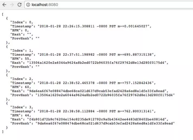 为了简化,我们直接以 JSON 格式返回整个链,你可以在浏览器中访问 localhost:8080 或者 127.0.0.1:8080 来查看(这里的8080就是你在 .env 中定义的端口号 ADDR)。